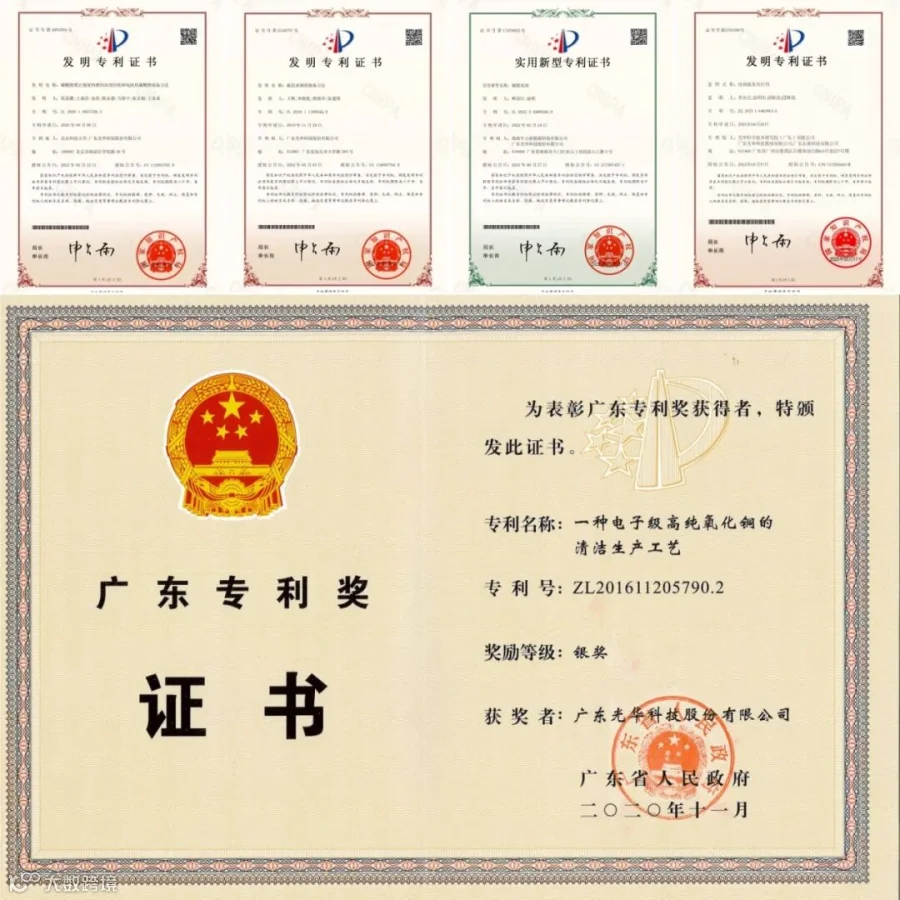 光华科技已于2019年通过了国家企业知识产权管理体系认证。截至目前,光华科技拥有的专利中,发明比例占97.14%,比初期发明比例31.25%已大幅度提升,发明专利128件,已注册商标125件,软件著作权20件,专利实施率达100%,专利技术得到很好的转化。在硬科技评级指数为AA优秀,在退役电池综合利用领域进行专利布局的1937家企业中排名前12%,创新力、竞争力、进化力和影响力四个维度均高于行业平均水平(来源:汕头市“三新两特一大”产业领域专利导航报告)。光华科技有效发明专利产业化率稳步提升,专利转化运用效益持续提高,特别是在“电子化学品”和“新能源、绿色材料、动力电池综合利用”两大板块有着深厚的专利布局和丰富的成果积累。