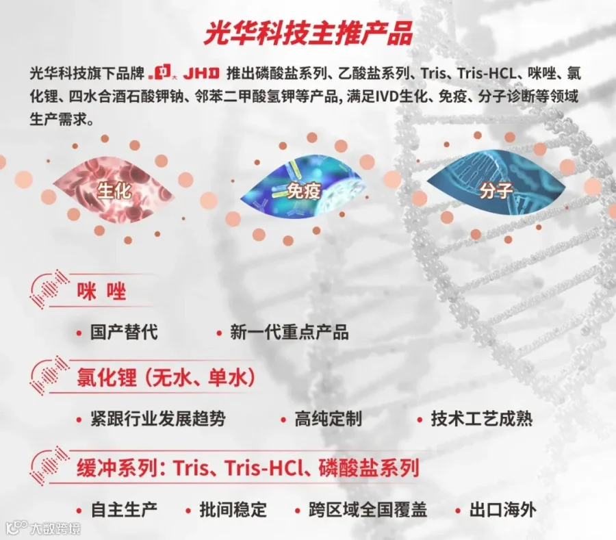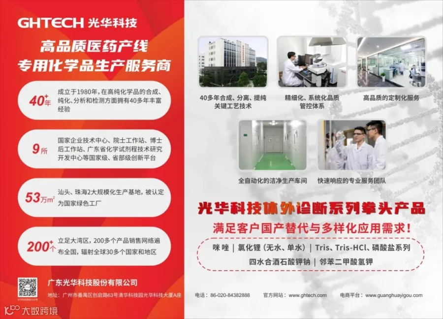 在体外诊断市场持续扩大的背景下,企业对诊断试剂的准确性、可靠性和稳定性要求也在不断提高。高品质的上游原材料和创新的制造技术成为市场竞争的关键,智能化、高通量、多元化成为体外诊断领域的重要发展方向。光华科技致力于为体外诊断领域提供高品质原材料,此次参展的磷酸盐系列、乙酸盐系列、Tris、Tris-HCL、咪唑以及氯化锂等产品,在免疫分析、生化检测和分子诊断等多个细分领域中发挥着不可或缺的作用。