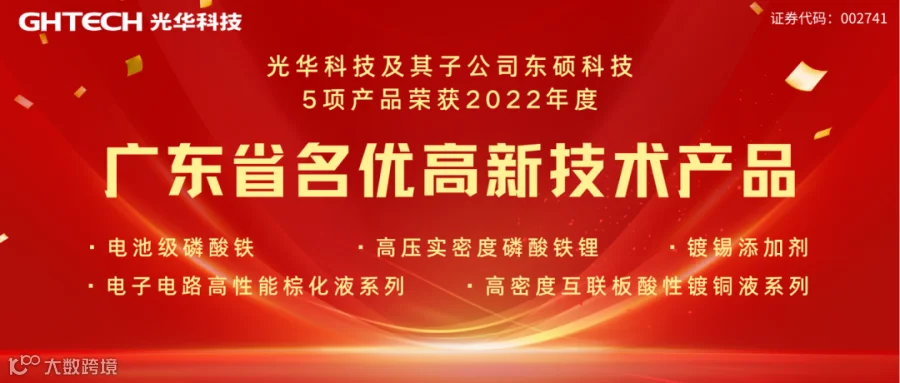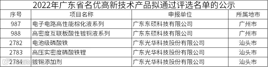 继光华科技“高纯电子级氧化铜”、“电池级碳酸锂”及子公司东硕科技“高密度互联板化学沉镍金液系列”三款产品被认定为2021年“广东省名优高新技术产品”后,公司五项产品入选“广东省名优高新技术产品”荣誉。