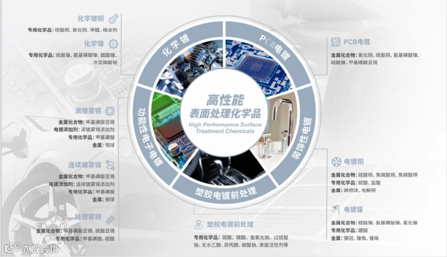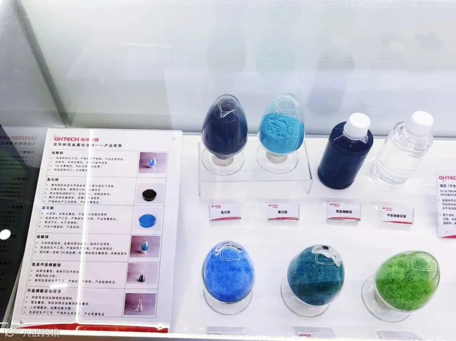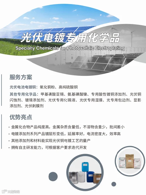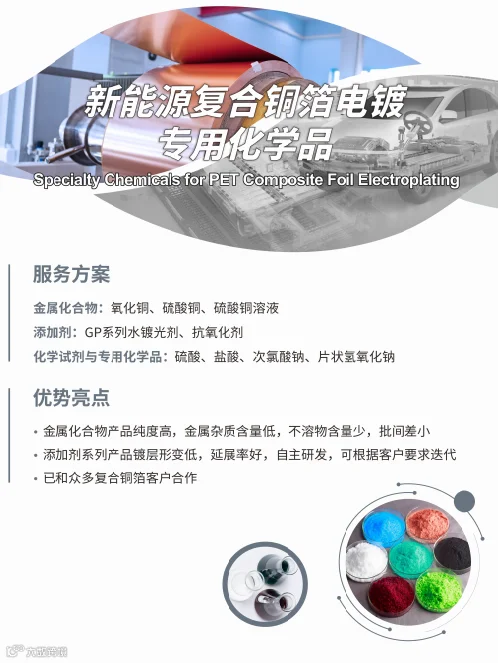 光华科技的高性能表面处理化学品涵盖了铜、镍、锡、钴等金属化合物、功能性电镀添加剂以及其他专用化学品等,先进的生产工艺、严格的生产控制,保障产品质量稳定。这些化学品广泛应用于新能源复合铜箔电镀、光伏电镀、化学镀、电子电镀、汽车零部件电镀等领域。