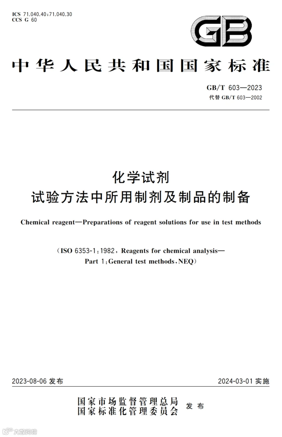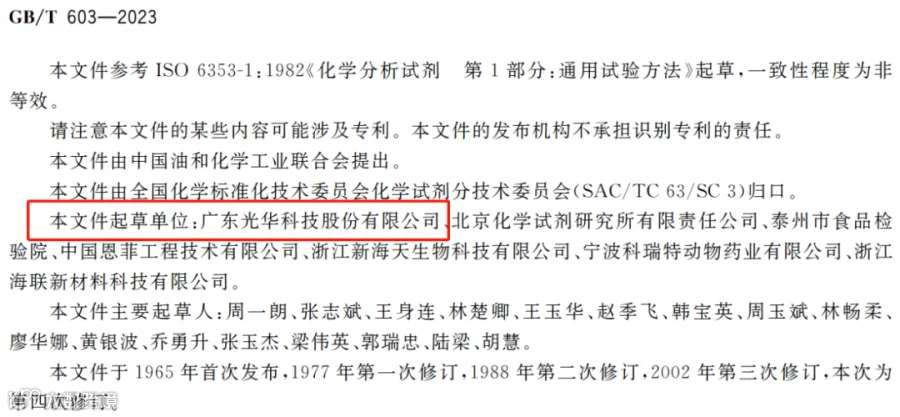 光华科技作为主要单位起草的GB/T 603-2023《化学试剂 试验方法中所用制剂及制品的制备》于2023年8月6日经国家市场监督管理总局(国家标准化管理委员会)批准发布,代替GB/T 603-2002《化学试剂 试验方法中所用制剂及制品的制备》,自2024年3月1日起实施。