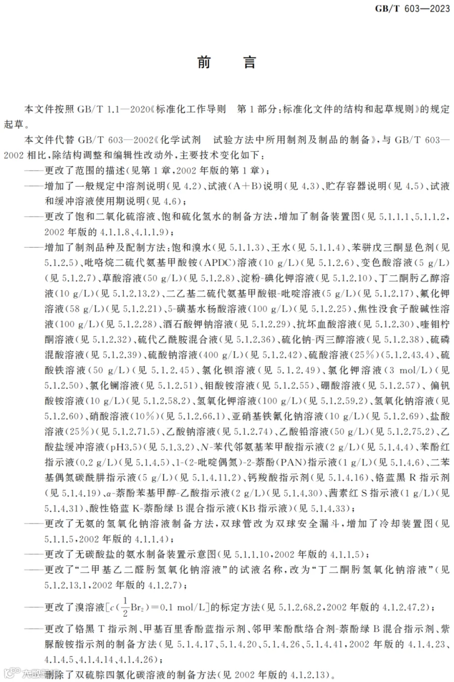 《GB/T 603 化学试剂 试验方法中所用制剂及制品的制备》是1965年首次发布,1977年第一次修订,1988年第二次修订,2002年第三次修订,本次修订是第四次修订。从标准的前三次修订历程看,标准基本都不超过15年就进行一次大修订,以适应发展需求。