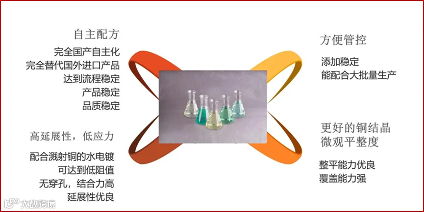 产品应用于高分子材料金属化后电镀增厚加工,采用直流电源,满足卷对卷连续电镀设备的加工,在较宽电流密度范围内均具有优异的镀层厚度一致性。其镀铜层致密细腻,且具有高延展性、热可靠性和低应力等优点。同时,光华科技的SP系列水镀光剂操作便利,各种有机添加剂均可采用 CVS 进行定量检测与监控。