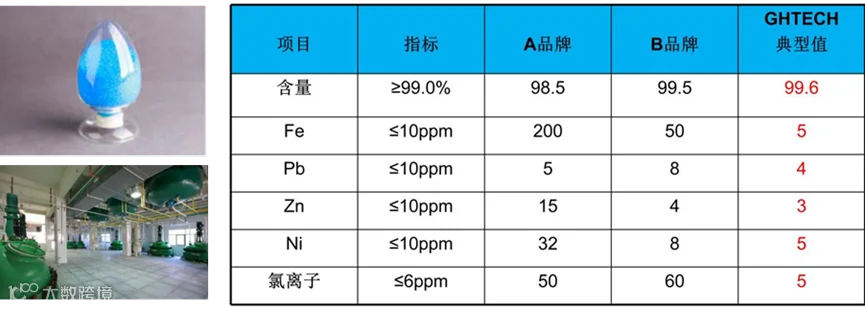 光华科技的硫酸铜纯度高,杂质含量极低,不含有机杂质。通过实测数据,A为日本某知名品牌,B为国内某知名品牌。GHTECH光华科技的产品质量优于A、B品牌。