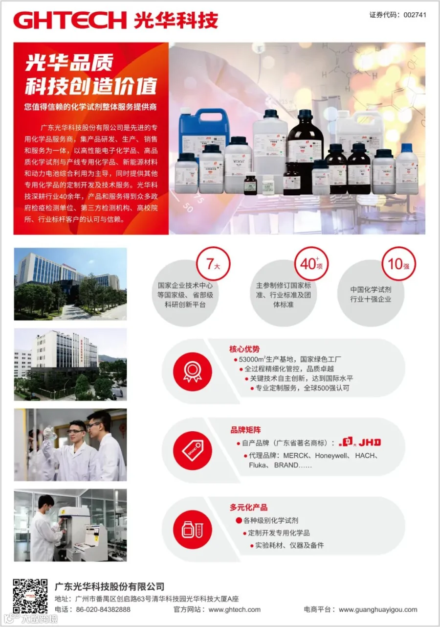 广东光华科技股份有限公司始创于1980年,集产品研发、生产、销售和服务为⼀体,以高性能电子化学品、高品质化学试剂与产线专用化学品、新能源材料和动力电池回收、综合利用为主导,同时提供其他专用化学品的定制开发及技术服务,致力成为国际高端专用化学品创新与整体技术服务方案领跑者,助力国家技术革新,引领产业链高质量发展。