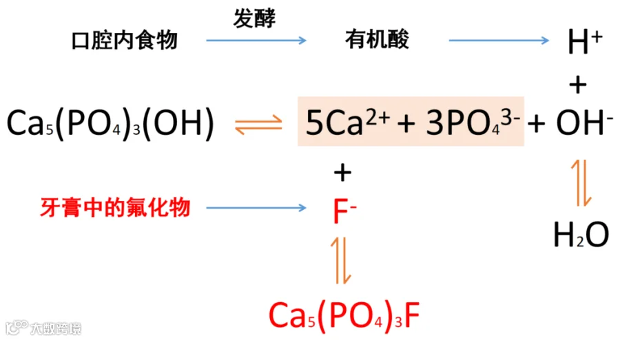 当口腔中细菌和酶作用于食物产生的有机酸,长时间与牙齿表面密切接触,便会使羟基磷灰石的溶解平衡朝着“脱矿”,即溶解的方向移动,生成的磷酸根离子 和钙离子向齿外扩散,溶解在唾液中,从而容易诱发龋齿。而在刷牙中,含氟牙膏中的氟离子能够使口腔中溶解的磷酸根离子 和钙离子发生 再矿化反应,生成氟磷灰石,氟磷灰石比羟基磷灰石更难溶于酸,所以能抵抗酸的侵蚀,达到预防龋齿的目的。