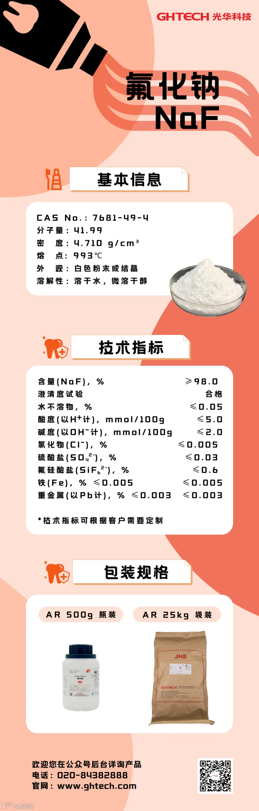 今天为大家介绍一种化学品——氟化钠。它是制造其他氟化物的主要原料,也是用作杀菌剂、水处理剂、陶瓷颜料等化学品的原料之一。而在众多用途中,氟化钠被人们知晓,往往是因为它也作为牙膏预防龋齿的有效成分,陪伴在我们的每个清晨与夜晚。
