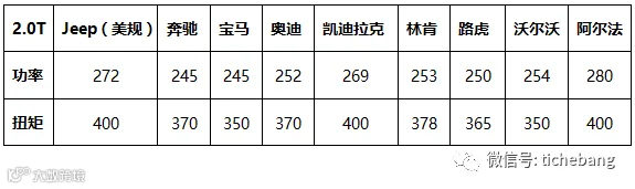汽车经过100多年发展,鉴于时间是每个人最好的师父,现在各家内燃机技术已经到了登峰造极的地步,但是只要还在这个框架内,再新的产品也很难做到秒杀。虽不能秒,杀还可以杀得精彩的。这台2.0T在主流标定处于什么位置,下表可以窥出一个大概——当然,只能“大面”,不能具体到车型,毕竟牧马人车型太特殊了,另外,标定到381马力的“神经刀”就不算在内了,这是有极端表现欲的“扎心老铁”。