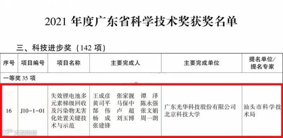 近日,2021年度广东省科学技术奖结果公布,广东科学技术奖是广东省在科技成果奖励方面的最高荣誉,其中由广东光华科技股份有限公司、北京科技大学作为主要完成单位的《失效锂电池多元素梯级回收及污染物无害化处置关键技术与示范》项目成果在产业化应用过程中产生了显著的社会经济效益,总体技术居于国际领先水平,荣获了2021年度广东省科学技术奖进步奖一等奖。汕头新闻综合频道对此进行了独家报道,以下是详细内容。