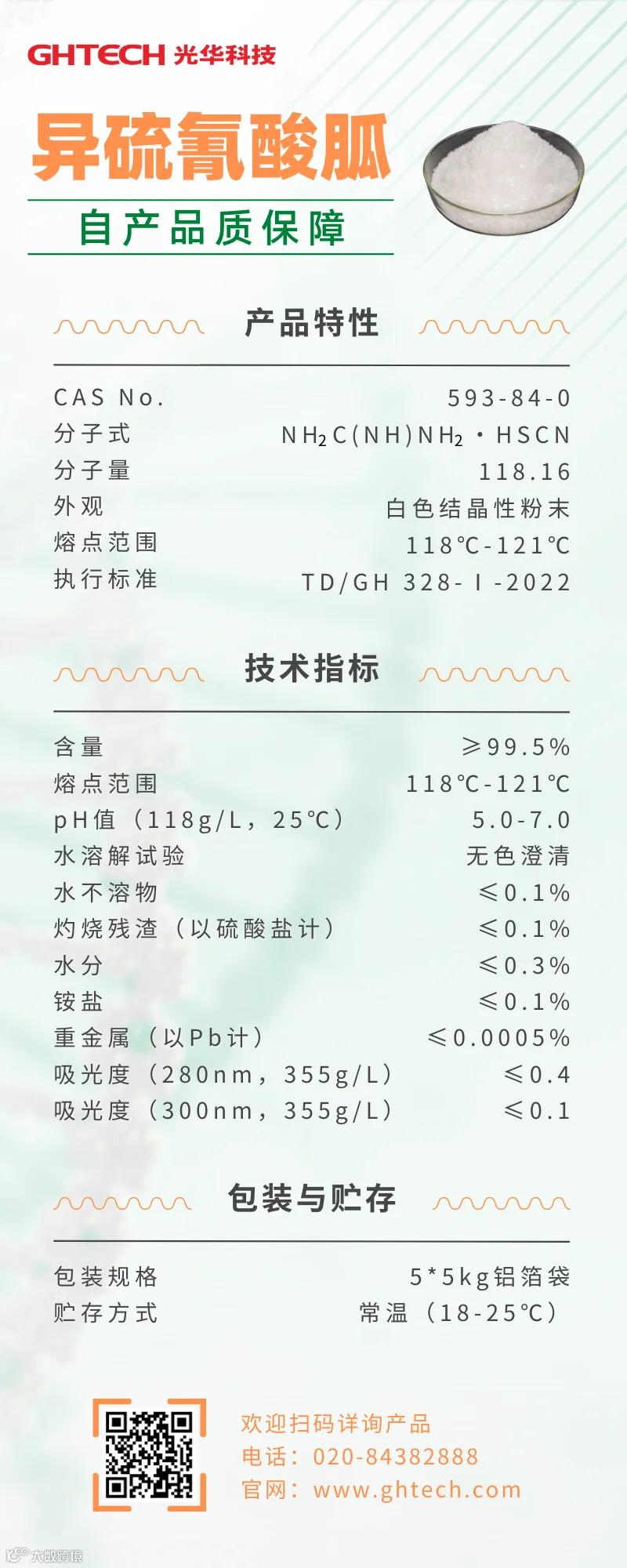 光华科技自1980年成立,四十余年深耕高品质化学试剂领域,集产品研发、生产、销售和服务为⼀体,在汕头拥有生产基地近300亩,整体产能规模达5万吨/年,目前已成功实现了异硫氰酸胍的自产,产品纯度高,品质稳定。若您有相关合作或技术咨询,可扫描文中二维码填写您的信息,或直接拨打光华科技联系电话(86)020-84382888,光华科技愿随时与您分享最新的研究和优质产品。
