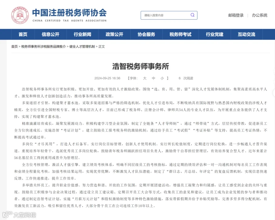 中国注册税务师协会网站推介刊载《健全人才管理机制品牌税务师事务所之:浩智税务师事务所》原文截图