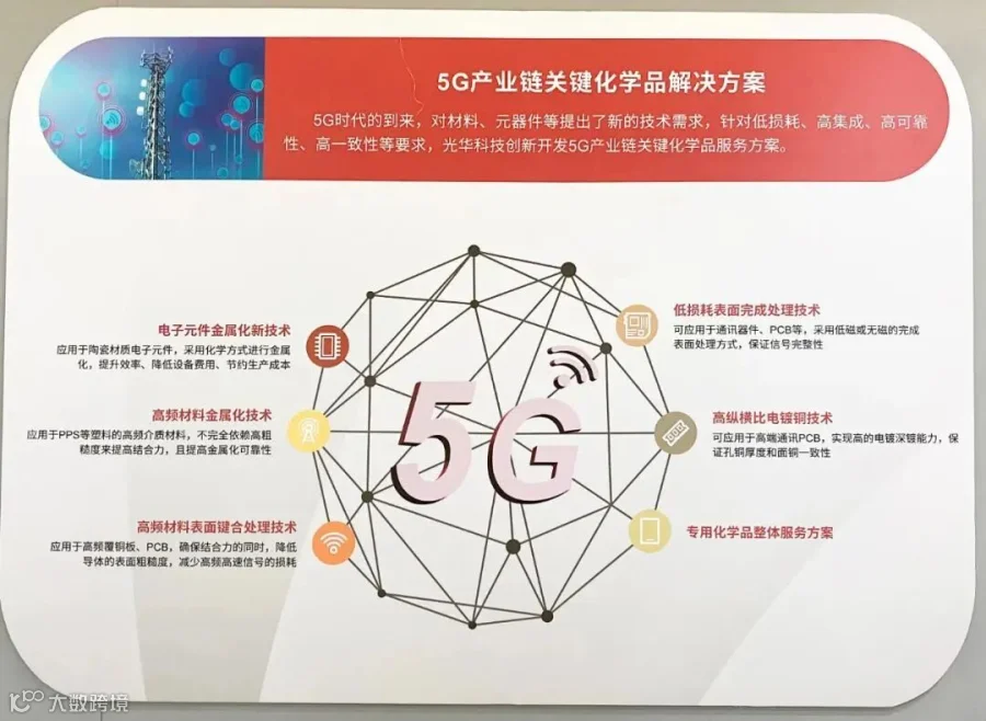 光华科技在5G电子元器件制造也已形成相关化学工艺产业布局,包括滤波器湿法金属化技术、天线振子PPS低轮廓下LDS激光雕刻技术、高密度互联电子电镀技术、通讯背板高纵横比孔脉冲电镀技术等,以及IC封装领域的镀铜柱、镀锡、光刻胶的前处理、显影、褪膜工艺,铜蚀刻、钛蚀刻技术等等,助力解决“卡脖子”技术问题,让产业供应链更安全与自主可控。
