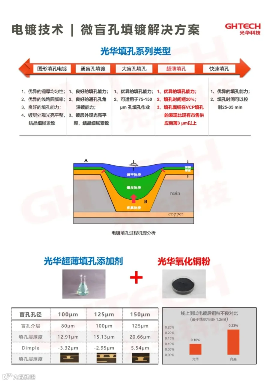 光华科技新一代超薄面铜填孔电镀整体解决方案具有制程效率高,填孔面铜在VCP填孔的表现比现有市售供应商薄3μm以上。此方案中,电镀液产品填补了国内快速、超薄填孔空白,达国际领先水平;搭配的自产可控的电子级高纯氧化铜,以高纯电解铜为原料,产品具体有纯度高、杂质含量低、品质稳定等优势,双双获得“国货新品”认定。
