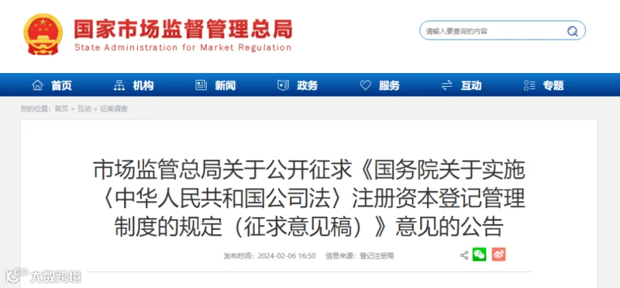 2月6日,国家市场监督管理总局发布关于公开征求《国务院关于实施〈中华人民共和国公司法〉注册资本登记管理制度的规定(征求意见稿)》意见的公告。