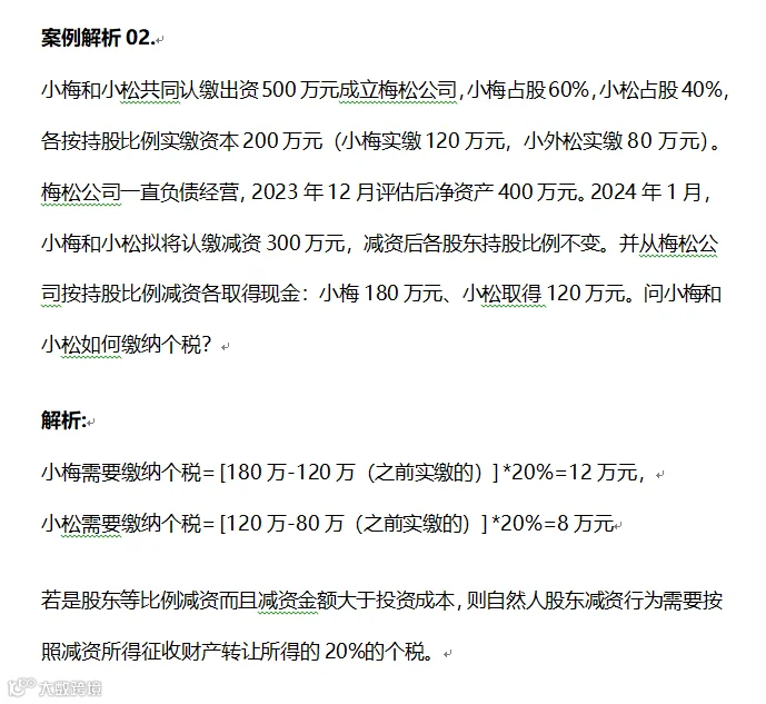 由于小梅的撤资所得并没有超过初始投资成本,因此小梅减资不涉及个税。