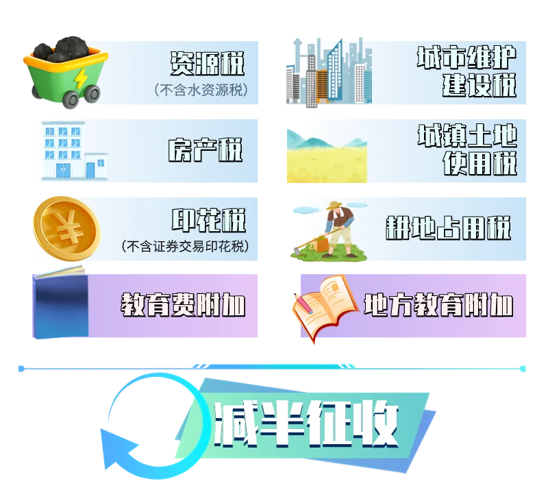 对增值税小规模纳税人、小型微利企业和个体工商户减半征收资源税(不含水资源税)、城市维护建设税、房产税、城镇土地使用税、印花税(不含证券交易印花税)、耕地占用税和教育费附加、地方教育附加。