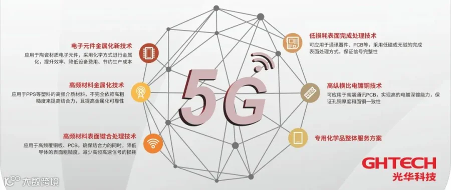 21世纪的第二个十年,全球经济形势多变,特别是5G通信+IoT物联时代的到来,5G引领高频、高速时代,IoT物联应用将顺利实现交互,将带来全球产业链的重组和跃升。光华科技洞察最前沿技术变革,当前正围绕国家重点关注的5G领域展开关键核心技术攻关,重点开发与5G基站、5G天线、终端的射频模块以及其他电路或元器件等相配套的关键电子化工新材料。目前,光华科技已设计并合成了一系列5G新型键合剂;已攻克化学钯与化学金在铜面直接沉积的技术难题;已开发出具有自主核心知识产权的脉冲电镀添加剂……同时,光华科技与下游产业、应用终端形成产业链协同开发的合作模式,共同推动国内5G技术的发展进程。