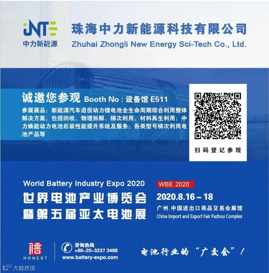 珠海中力新能源科技有限公司参展世界电池产业博览会暨第五届亚太电池展(以下简称 WBE 2020),将携新能源汽车退役动力锂电池全生命周期综合利用整体解决方案,包括回收、物理拆解、梯次利用、材料再生利用;中力焕能动力电池后装性能提升系统及服务;各类型号梯次利用电池产品等,亮相WBE 2020!