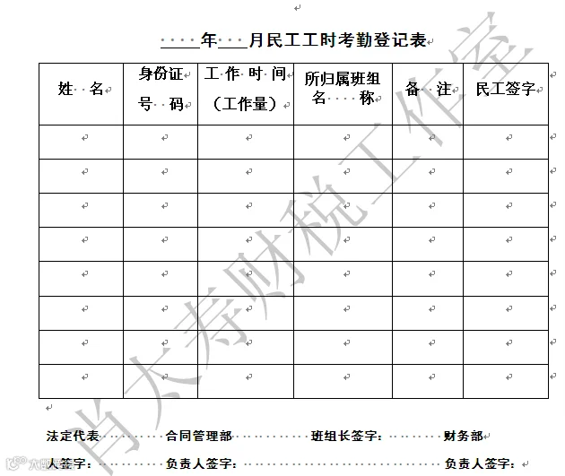 当劳务公司与农民工签订劳动合同或非全日制用工合同时,则劳务公司的合同管理部门必须每月依照“劳动合同签订名单名册”上的民工姓名对劳资专管员递交给合同管理部门的“民工工时考勤记录表”上的民工姓名进行核对,确保“民工工时考勤记录表”上名单的真实性。然后法务部门或合同管理部门负责人在审核后的“民工工时考勤记录表”上的“核对人”栏上签字后,将一份“民工工时考勤记录表”递交给建筑企业财务部作为代发民工工资的依据;另一份递交给劳务公司财务部做账的依据。具体的表格格式如下: