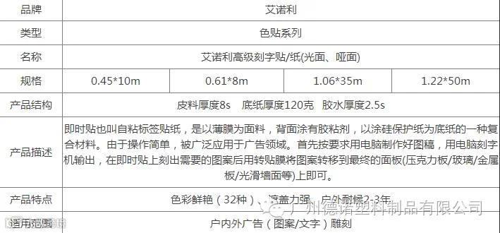 广州德诺塑料制品有限公司色贴也叫自粘标签贴纸,是以薄膜为面料,背面涂有胶粘剂,以涂硅保护纸为底纸的一种复合材料。由于操作简单,被广泛应用于广告领域。首先按要求用电脑制作好图稿,用电脑刻字机输出,在即时贴上刻出需要的图案后用转贴膜将图案转移到最终的面板(压克力板/玻璃/金属板/光滑墙面等)上即可。