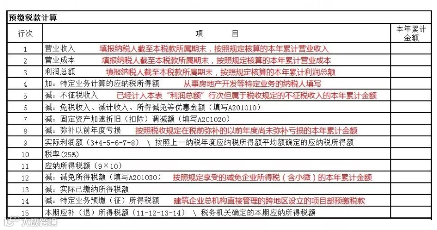 表格中间部分为预缴税款计算,与以前表基本一致,但减少了本期金额。只要填写本年累积金额即可。
