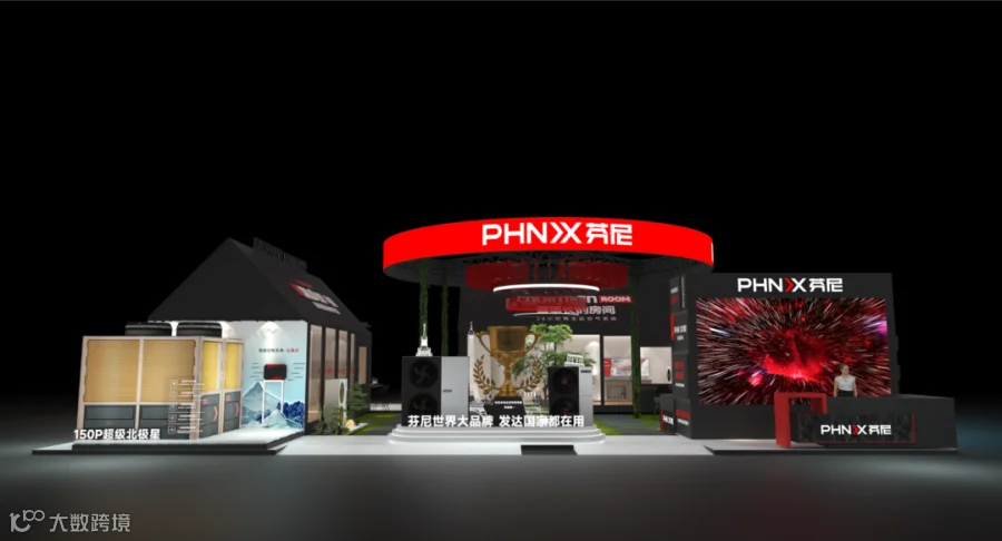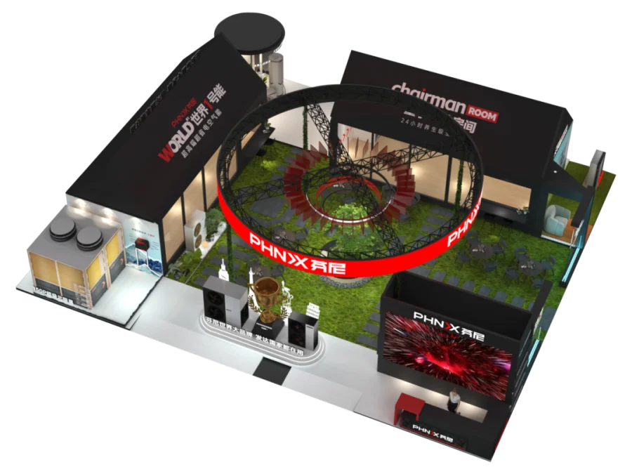 芬尼此次打造的展厅极具设计感,以简约大气的开放式布局为主,融入黑红主色调与流畅线条,将科技感与时尚感完美融合,既彰显品牌高端质感,又能让观众沉浸式感受产品魅力。
