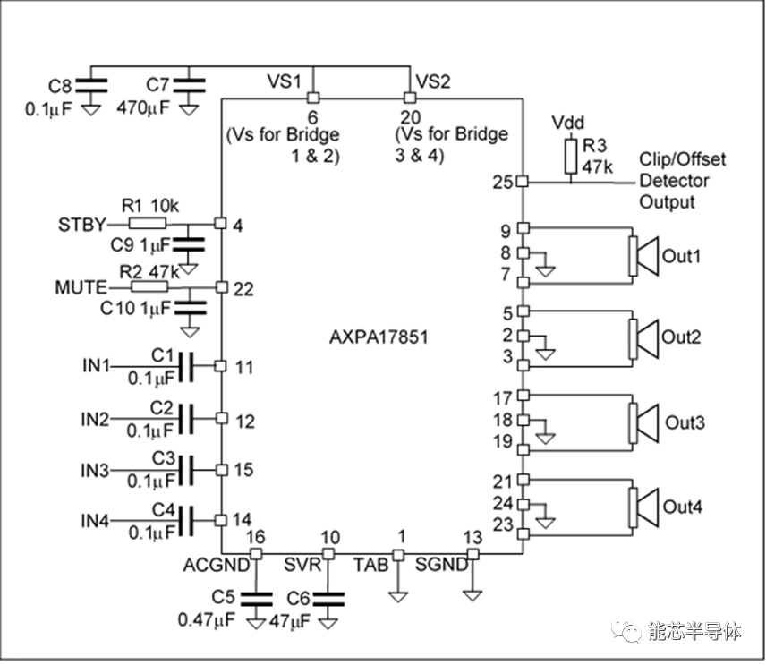 AXPA17851采用AB类放大器设计,在音质方面完胜D类音频功率放大器,并且不会对车上的其他设备产生电磁干扰。产品提供四路独立的信号通路,一颗芯片就能够满足车载应用左右及前后喇叭的驱动。高集成度的设计使得芯片的外围电路非常简单,只需要少量的输入耦合电容及SVR电容即可工作。芯片的输出采用桥式结构,外围电路不需要输出耦合电容和补偿电路,整体成本极大地降低。
