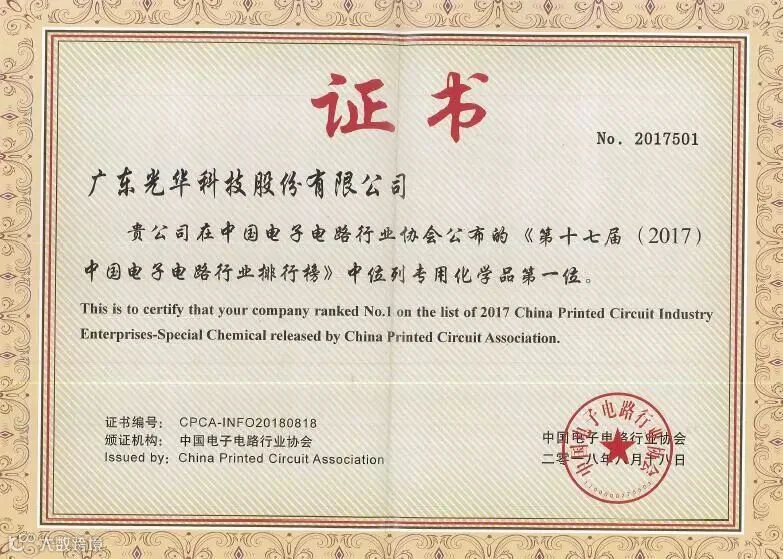 * 连续8年荣获CPCA中国电子电路行业排行榜-专用化学品领域第1名