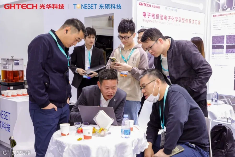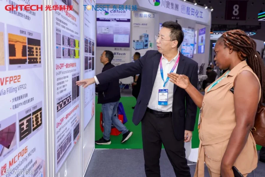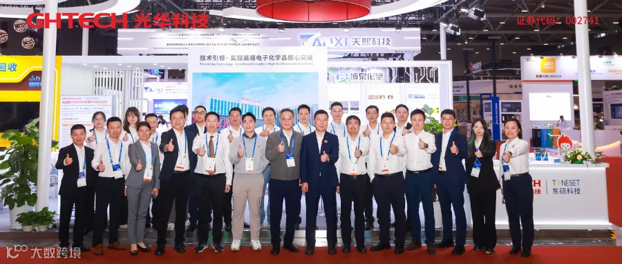 GHTECH光华科技以 “技术引领・实现高端电子化学品核心突破”为主题参展,带来了 AI 驱动下高端湿电子化学品解决方案,贯穿从内层处理到完成表面处理的全链条关键制程,针对行业中普遍存在的高频高速信号完整性、精细线路侧蚀控制、高阶HDI极端信赖性等技术瓶颈,提供系统的整体解决方案: