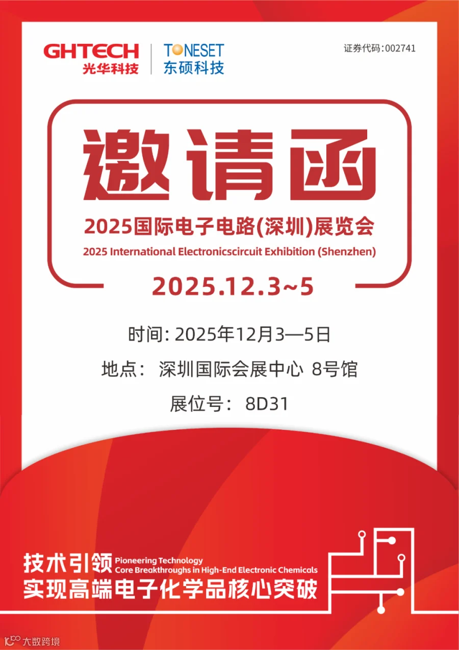 12月3日至5日,国际电子电路(深圳)展览会(HKPCA Show)将在深圳国际会展中心(宝安)举办。GHTECH光华科技及成员企业TONESET东硕科技将以“技术引领 · 实现高端电子化学品核心突破”为主题,携新一代PCB、封装载板、半导体与先进封装互连技术等创新方案亮相,诚邀您莅临8号馆8D31展台,共同探讨AI时代技术突破与未来趋势。