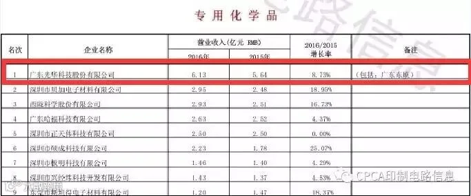 近日, 中国电子电路行业协会CPCA重磅发布了第十六届(2016)中国电子电路行业排行榜,光华科技再次蝉联中国电子电路行业专业化学品领域第1名。