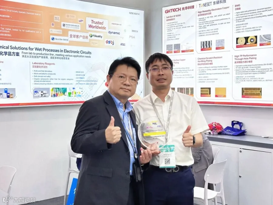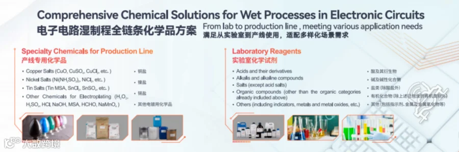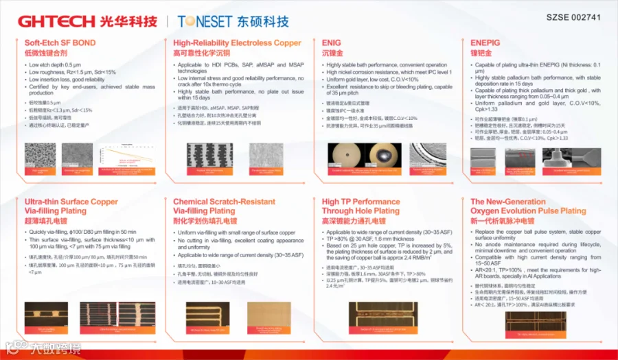 旗下东硕科技“TONESET”品牌的配方型药水,满足应用于消费电子、汽车电子、网络通信等领域的多层板与HDI制造需求,涵盖内层处理、孔导通化、镀铜制程、线路形成、完成表面处理等制程,产品包括填孔镀铜制程、VCP电镀制程、脉冲电镀、化镍(钯)金制程、沉银沉锡制程、高频高速铜面键合技术、封装基板解决方案等电子电路制造核心化学原料。