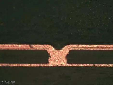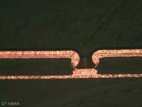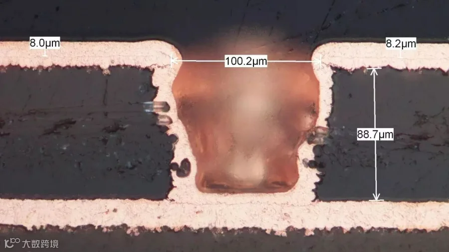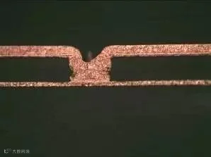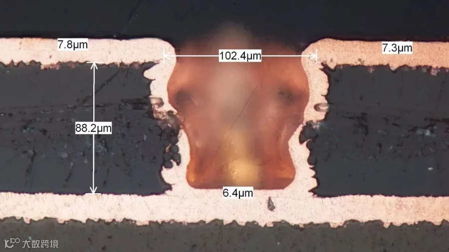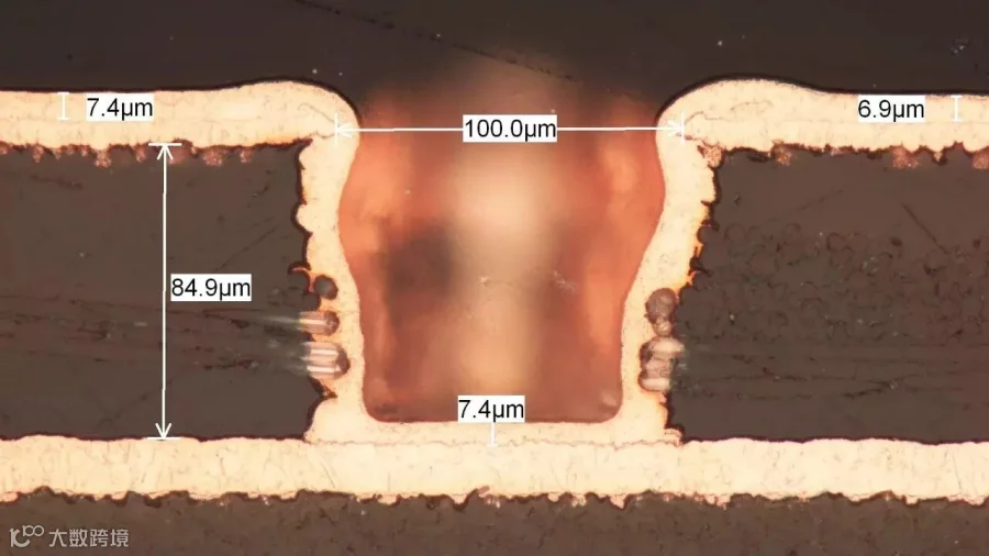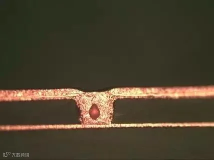 由上图可以看出,部分闪镀层未能很好的覆盖盲孔中的玻纤,导致填孔失败,说明本次问题出现在SOC制程对玻纤的调整上。通过对调整剂的改进,使用新的调整剂,终于换得了良好的闪镀效果。