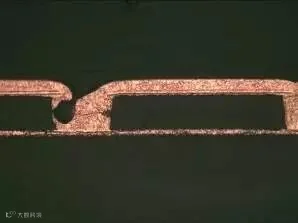 这是一个最方便快捷的流程,流程短、排污低、节能高效,表面铜厚能得到有效地控制,适合做精细线路的电路板。当然,这种工艺对盲孔的钻孔质量要求更高,最好是没有悬铜和孔壁突出的玻纤,而且SOC的制程控制较为严苛,对于盲孔而言,SOC导电性不如PTH沉铜层好,且没有金属做铜生长的晶核,填镀铜时首先铜会在孔口盲孔底部开始长铜,并双向向中间延伸到盲孔中部直至整个孔镀上一层铜,整个长铜过程仅需1min以内,其后电镀过程与PTH电镀过程一致。填镀药水也需要有一个好的上铜速率表现,不同的材料也会影响盲孔的填镀品质,比较容易出现填镀不良造成凹陷过大、空洞甚至漏填等问题(如下图三所示)。