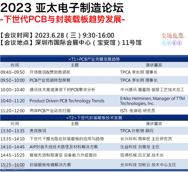 亚太电子制造论坛:关注PCB产业先进趋势由台湾电路板协会(TPCA) 主办的亚太电子制造论坛也将在6/28举办,TPCA将倾情打造两岸最专业最具品质的技术论坛活动,聚焦高频高速、HDI、高多层、IC载板、碳中和、电动车等PCB产业最热门的议题及技术发展趋势,值得期待!