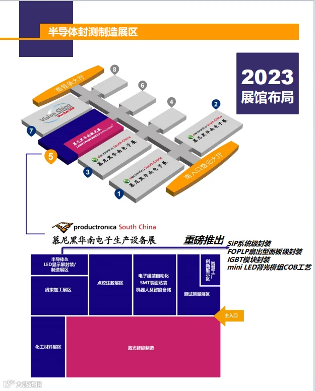 慕尼黑华南电子生产设备展顺应发展趋势,打造半导体封装及制造板块。主题专区将集中展示SiP系统级封装、FOPLP扇出型面板级封装、背光模组COB工艺等,邀请到来自芯片、封装/模组、显示屏、材料、设备等各个环节的头部厂商莅临参与,为OSATs、EMS、OEMs、IDM、无晶圆厂半导体公司和硅晶圆代工厂以及材料和设备供应商提供一站式的前沿技术交流平台。