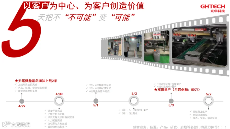 光华科技的销服团队在详细了解客户详细情况后并没有犹豫,当天紧急组织评估,调动资源,业务、技术服务、产品、研发、后勤等多个部门同事主动放弃了假期,协力投身于这场艰巨的任务之中,并凭借着过硬的物流体系、销服团队及技术水平,不负客户的期望。光华科技在短短的5天时间为客户完成了2条化镍金产线,从备货、运输、测试、调整、评估的全流程并上线生产,将“不可能”变成了“可能”,将“以客户为中心,为客户创造价值”的理念化为了行动。