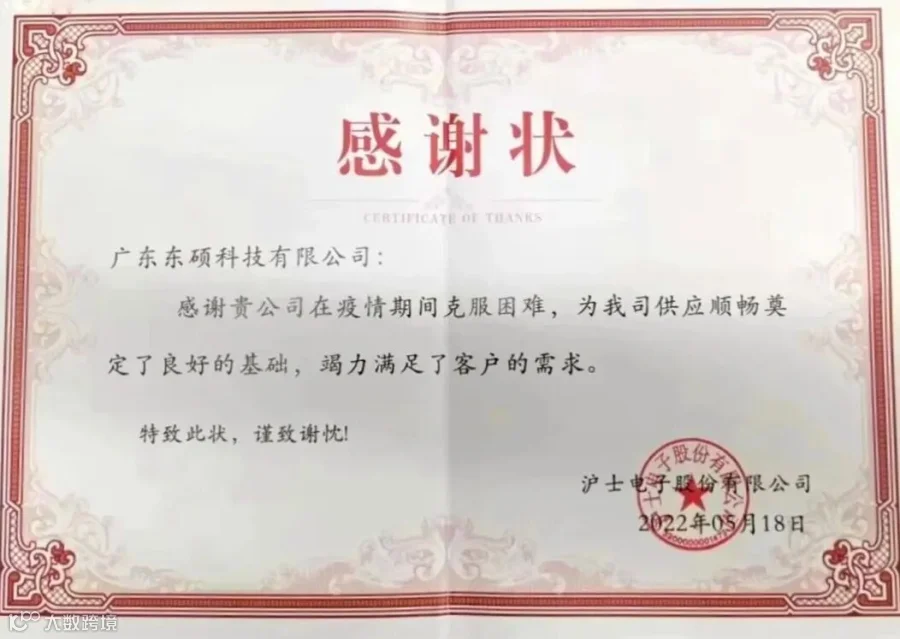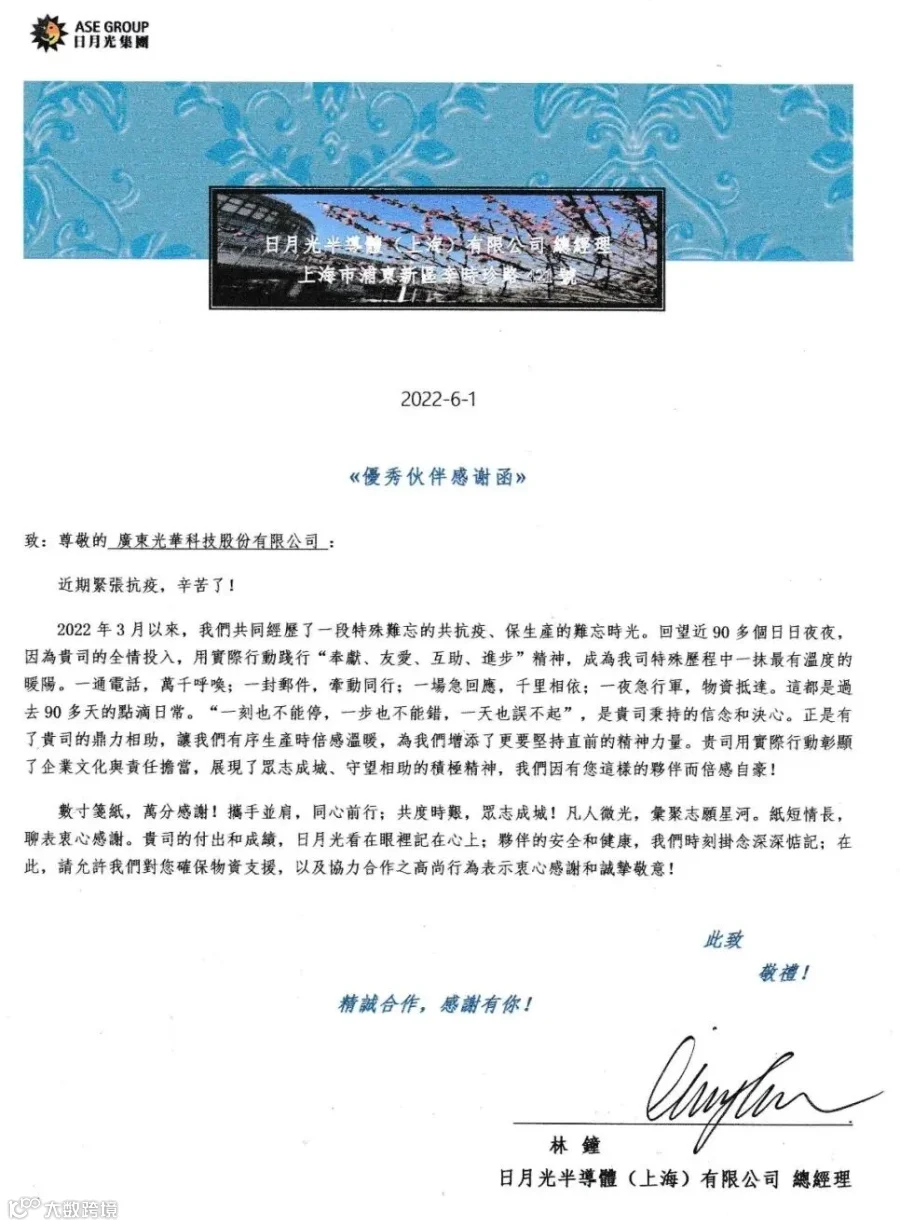 一通电话,同心共进,一封邮件,跨越千里。2022年上半年,上海、江苏等多地出现疫情,客户的原料供给遇到了巨大的挑战。在此艰难时刻,光华科技华东区域的销售、客服、技服工程师成为了一个“光华铁三角”,时刻保持着与客户的联系,快速应对各项突发情况,为客户们紧急调度、全力组织、协调货源、高效配送、协助上线,遵循着“以客户为中心,为客户创造价值”的理念。最终,光华科技在近两个月最艰难的抗疫时间里,成功保障了客户的原料供给,用实际行动赢得了客户的肯定与信赖。光华科技连续被南亚电路板(昆山) 有限公司、日月光半导体(上海)有限公司评为优秀供应商,旗下全资子公司东硕科技也收到沪士电子股份有限公司的感谢状。