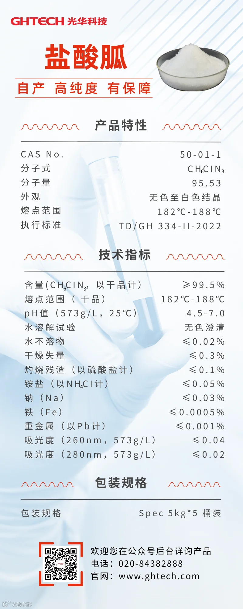 光华科技重视生物医药领域的发展机遇,重点布局相关高端专用化学品,继推出硫氰酸胍后,凭借自身在纯化工艺环节的专业技术水平,再次推出新产品盐酸胍:自产、高纯度、品质有保障。若您有相关合作或技术咨询,可留言光华科技公众号后台,或直接拨打光华科技联系电话(86)020-84382888,光华科技愿随时与您分享最新的研究和优质产品。