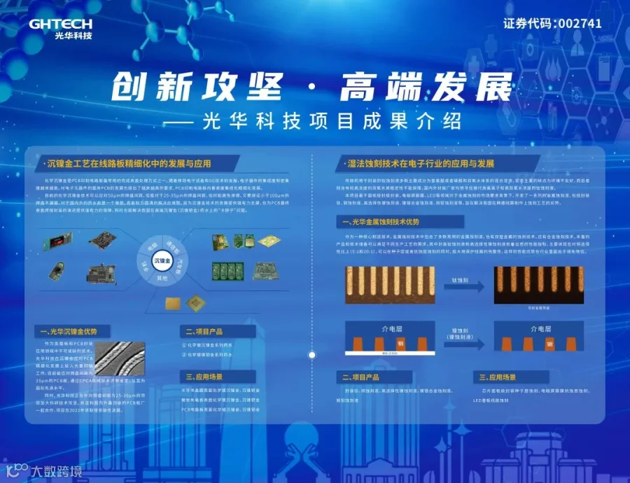 为贯彻落实广东省《关于培育发展战略性支柱产业集群和战略性新兴产业集群的意见》相关工作部署,2022年3月17日,由汕头市市场监督管理局(知识产权局)指导,化学与精细化工广东省实验室、广东光华科技股份有限公司和广州恒成智道信息科技有限公司主办的“汕头市电子化学品产业专利导航报告成果发布会暨产业知识产权运营中心揭牌仪式”在汕头举行。活动上,汕头首个针对特定产业的知识产权运营中心揭牌运作,并剖析了电子化学品产业现状与技术创新趋势,发布了多项科技成果,其中光华科技在活动上发布了应用于精细线路的沉镍金工艺与应用于封装等领域的湿法蚀刻技术两项创新成果。