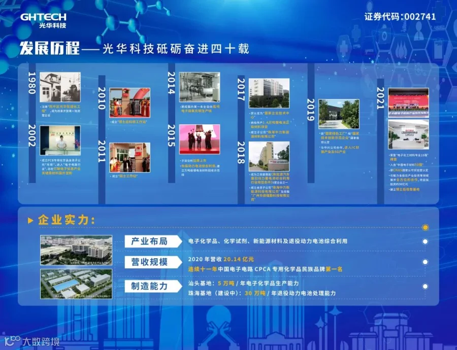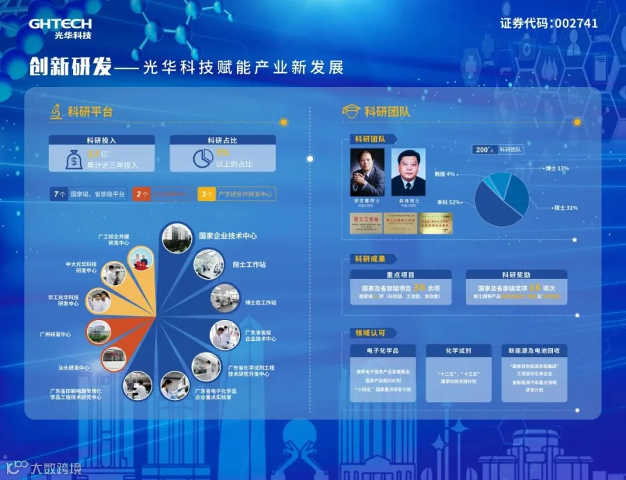 广东光华科技股份有限公司始创于1980年,集产品研发、生产、销售和服务为⼀体,以高性能电子化学品、高品质化学试剂与产线专用化学品、新能源材料和动力电池回收、综合利用为主导,同时提供其他专用化学品的定制开发及技术服务,致力成为国际高端专用化学品创新与整体技术服务方案领跑者,助力国家技术革新,引领产业链高质量发展。