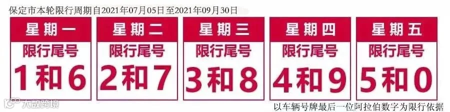 按照保定市政府实施的限行规定,2021年7月5日起,新一轮尾号限行将开始。自2021年7月5日至2021年9月30日,星期一至星期五限行机动车号牌尾号分别为1和6、2和7、3和8、4和9、5和0。