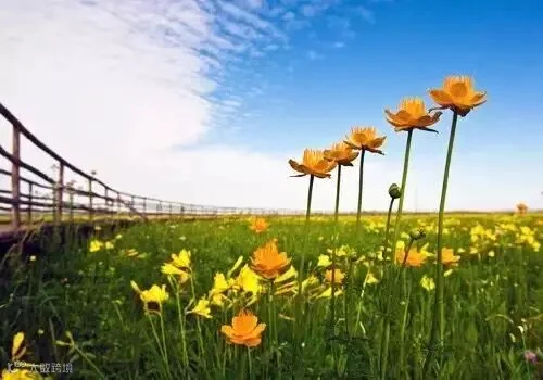 从盛夏到秋初的6-8月间,甸内又盛开了金莲花和黄花。远观整个草甸呈现出一片高贵典雅的金黄,置身其中,觉得有一种雍荣华贵的荣宠,此时风轻气爽,正值旅游旺季,大批游客来临,在金黄色的海洋中览花赏景、驰骋留影,尽情享受大自然的秀美。
