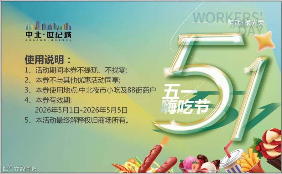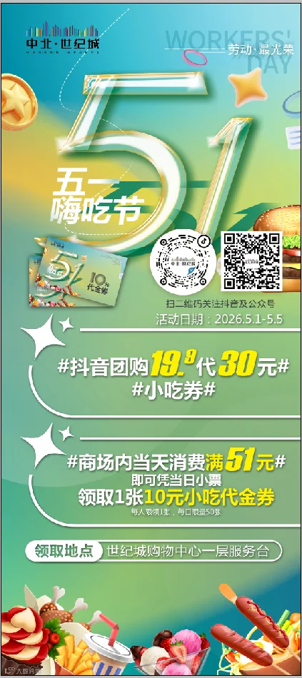 商场内当天消费满51元即可凭当日小票领取1张10元小吃代金券。
