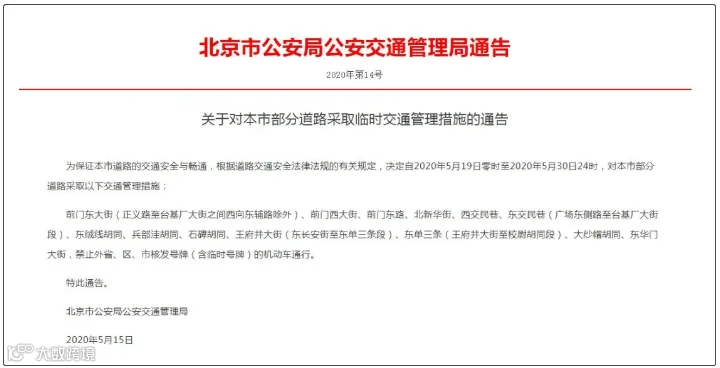 5月17日,北京市公安局公安交通管理局网站发布通告:19日0时至30日24时,对北京市部分道路采取以下交通管理措施。
