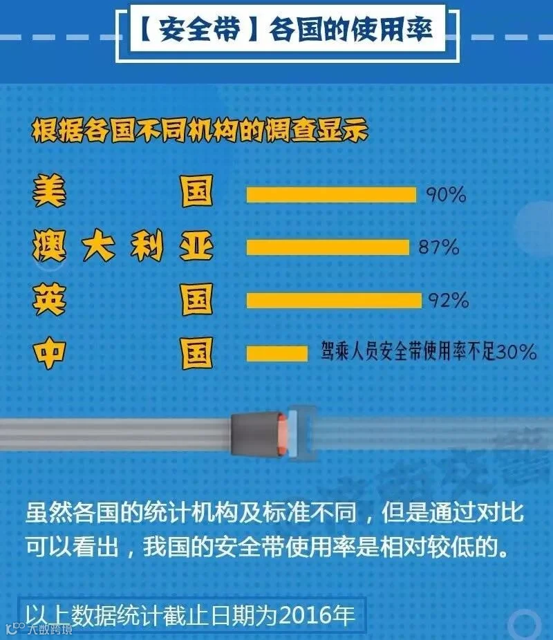 因为各国的立法、处罚标准、文化等存在差异,所以各国安全带的使用率也存在较大差异。