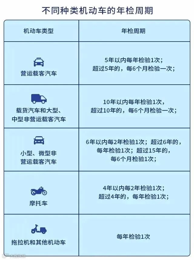 ③ 营运载客车辆:前5年每年年审1次,第6年起为6个月