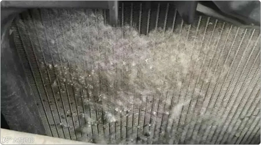 空调冷凝器和水箱都位于车头的位置,当车辆在行驶时,空气会顺着中央进气格栅吹进冷却,所以空气中夹带的飞絮、树叶等脏东西就会附着在空调冷凝器和水箱散热器上。