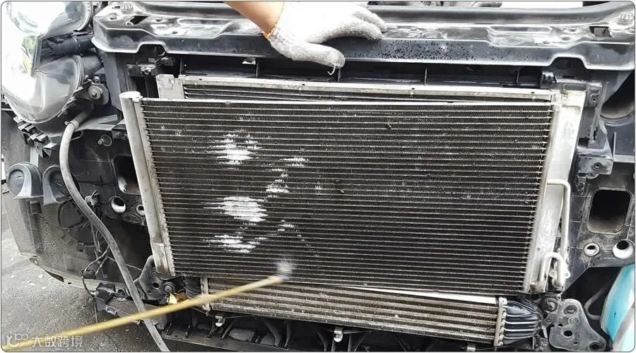 正确的清洗方法应该进行拆卸,将水箱和冷凝器分开。用小刷子或高压气枪将水箱缝隙内的污垢清除,再用清水冲洗表面。在这个过程中,要注意不要破坏铝片和水管,因为铝片很容易变形稍微一用力就会损坏。过多的铝片损坏会造成散热不良,而水箱上水管被破坏则会产生防冻液泄漏。
