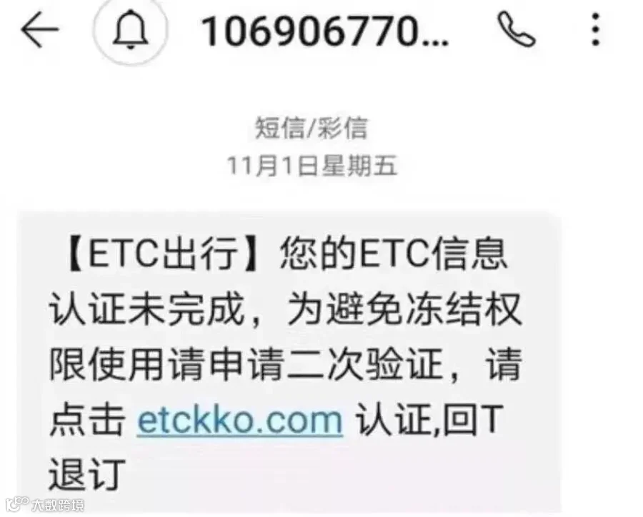 【ETC出行】您的ETC信息认证未完成,为避免冻结权限使用请申请二次验证,请点击(链接)认证,回T退订。
